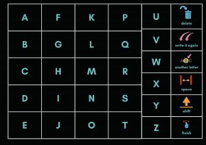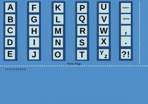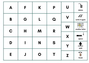 Below are a few different options of non-electronic displays for people using Partner Assisted Scanning who are transitional or conventional literacy learners. Some of these are in alphabetic order, which is often easier for someone who is just learning to control the alphabet with partner assisted scanning, and some of these are in an order where the letters are arranged by frequency of use in English. The frequency of use order can be much more efficient, for an experienced literacy user.